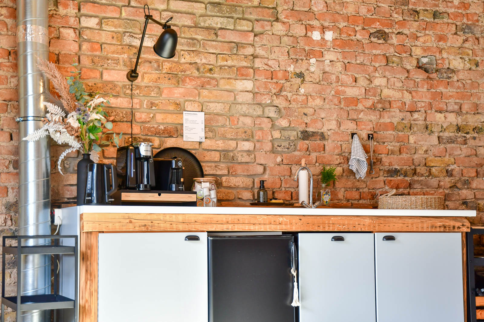 - Küchenzeile mit Spüle, Kühlschrank, Wasserkocher, Kaffeemaschine